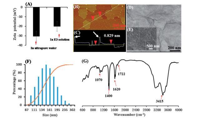 本研究詳細(xì)考察了E3溶液中氧化石墨烯的特性。我們在230納米波長處檢測到一個峰值,在大約280納米波長至300納米波長處檢測到一個峰肩,這與氧化石墨烯的典型紫外吸收光譜相符。然而,在超純水中,氧化石墨烯的zeta電位為-30.5mV,而在E3溶液中則升至-20.1mV(圖1A)。TEM和SEM圖像顯示了氧化石墨烯納米片的不規(guī)則褶皺,這反映了氧化石墨烯的柔韌性(圖1D和E)。原子力顯微鏡成像顯示,氧化石墨烯納米片的厚度約為0.8-1納米(圖1B和C),直徑約為101-258納米(以147納米為中心),這是通過廣角光散射測量的(圖1F)。氧化石墨烯的傅立葉變換紅外光譜清楚地顯示了-OH(~3340cm-1)、C=O(~1720cm-1)、C=C(~1620cm-1)、C-OH(~1400cm-1)和C-O-C(~1070cm-1)官能團(tuán)的存在(圖1G)。上述結(jié)果驗證了所使用的納米材料是典型的氧化石墨烯。此外,EDX圖像按原子百分比記錄了86.44%的C、12.74%的O、0.02%的S、0.01%的K和0.79%的Cu(主要由銅網(wǎng)格貢獻(xiàn))。