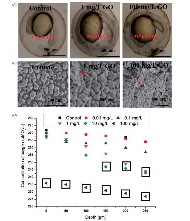 在對照樣本中,絨毛膜附近的氧氣濃度為271毫摩爾,當(dāng)微電極插入胚胎250毫米深處時,絨毛膜空間的氧氣濃度逐漸下降到264毫摩爾(圖2C)。對于暴露于1、10和100毫克/升氧化石墨烯的胚胎,在250毫米的深度,氧氣濃度分別變?yōu)?44、243和227毫摩爾,與對照組相比顯著下降(p<0.05)(圖2C)。此外,用氧化石墨烯處理的脫絨毛胚胎與對照組的氧氣濃度沒有明顯差異。這些數(shù)據(jù)表明,氧化石墨烯的包被會導(dǎo)致胚胎缺氧。
