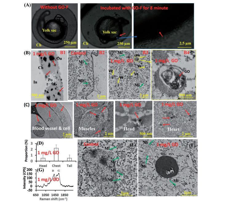 圖3、(C)96hpf后斑馬魚胚胎中氧化石墨烯的定位。(D)胚胎中氧化石墨烯的半定量分析是通過ImageJ軟件根據氧化石墨烯聚集面積與整個圖像面積之比進行的。(E)和(F)36hpf時氧化石墨烯對胚胎線粒體的損傷。(G)胚胎中氧化石墨烯聚集體的拉曼光譜。氧化石墨烯-F:用異硫氰酸熒光素標記的氧化石墨烯;TEM:透射電子顯微鏡。