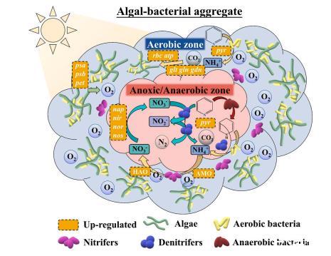 這項研究為同時去除含氮有機化合物和氮的藻類-細菌聚集體(ABA)系統提供了新的線索。ABA系統是通過將預培養的藻菌菌群接種到活性污泥中構建的。硝化-反硝化作為共代謝過程,增強了吡啶和氮的同時去除。ABA中需氧和缺氧/厭氧生物過程的共存在微生物代謝和轉錄水平上得到了證實。ABA系統主要排放藻類-細菌生物量、O2和N2,導致溫室氣體排放近乎零,能耗極低,顯示出協同廢水回收和碳中和的多重功能的巨大潛力。