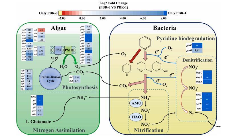 圖7顯示了ABA系統中的微生物代謝機制和基因表達。通過將預培養的藻類-細菌共生體引入活性污泥,同化、硝化和反硝化可以共存為無需添加額外碳源的氮轉移途徑。首先,通過利用O2和NO3-作為電子受體,將吡啶-N通過吡啶生物降解轉化為NH4+-N。與PBR-0相比,pyrB和pyrE編碼的吡啶降解在PBR-1中上調并且僅在PBR-1中表達,表明了更高效和多樣化的吡啶生物降解。然后,NH4+-N可以通過硝化轉化為NO2--N和NO3--N,而NO2--N和NO3--N通過異養反硝化作用轉化為N2。如圖S10所示。參與硝化-反硝化的關鍵酶,包括AMO、HAO、NAR、NIR、NOR和N2OR只存在于PBR-1中。參與反硝化酶的基因,包括napA、napB、napC、nirS、norB、norC和nosZ,僅在PBR-1中表達。相反,在PBR-0中它們沒有表達。因此,硝化-反硝化在PBR-1的ABA系統中對吡啶和氮的去除起到了關鍵作用。
