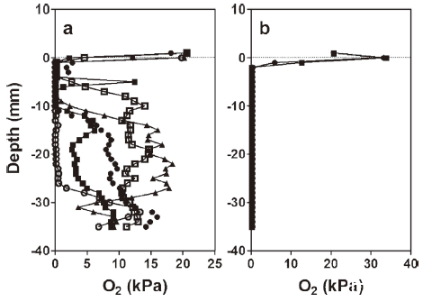 圖3、英國蘇塞克斯郡肖勒姆海邊鹽沼的土壤氧分壓隨深度變化的剖面圖;不同的線條(和符號)代表重復(fù)測量的剖面。(a)海濱堿蓬生長區(qū)域的土壤;(b)稀疏分布著Salicornia sp.的泥灘。海濱堿蓬生長區(qū)域(a)比泥灘(b)高出33厘米。這些測量是在2010年7月20日進行的,當(dāng)時7:00的高潮位為5.17米,測量時間在高潮后3小時內(nèi)。測量期間的光合有效輻射(PAR)在(a)中為~360–420μmol m?2s?1,在(b)中為~615μmol m?2s?1。這次潮汐淹沒了泥灘(水位高出表面約3厘米),但沒有淹沒海濱堿蓬生長區(qū)域。海濱堿蓬生長區(qū)域在前一晚被5.37米的潮汐淹沒。圖中比較了海濱堿蓬的生長區(qū)域和泥灘區(qū)域的土壤氧含量隨深度的變化。結(jié)果顯示海濱堿蓬的生長區(qū)域的土壤在表層以下仍有一定量的氧,而泥灘區(qū)域的土壤在2毫米以下就幾乎檢測不到氧。這表明海濱堿蓬生長區(qū)域的土壤有更好的排水和氧進入條件。