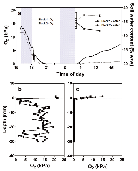 圖5、(a)含有海濱堿蓬的土壤塊在溫室水槽實驗中10毫米深度處的土壤氧對淹沒的響應(yīng)。灰色背景表示淹沒期。含有植物的土壤塊是從英國蘇塞克斯郡肖勒姆海邊的鹽沼中挖掘出來的,并插入到單獨的土壤篩中(底部有網(wǎng)眼以便水的進出和排水),并放置在水槽內(nèi)的礫石上。一個由定時器控制的潛水泵將半濃度人工海水輸送到水槽中,以模擬潮汐(水位高出土壤表面2厘米);一次淹沒在下午,一次在第二天早上。使用文中所述的氧微電極進行測量。圖(a)中的插圖還顯示了第二次淹沒期間土壤含水量隨時間的變化。還測量了土壤塊在淹沒前(b)和淹沒后約2小時(c)的土壤氧分壓隨深度的剖面。圖中展示了在控制實驗條件下,土壤氧含量在淹沒期間的變化。結(jié)果顯示,淹沒期間土壤氧含量顯著下降,且在淹沒后繼續(xù)下降。這與實地測量結(jié)果一致,進一步證實了潮汐淹沒對土壤氧含量的影響。