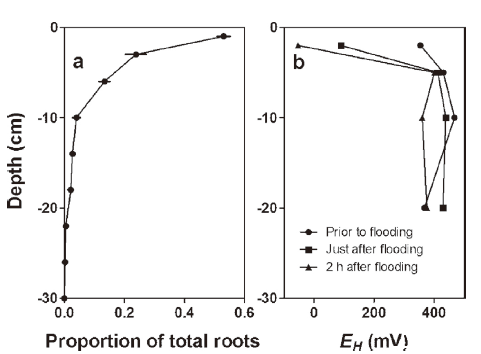 圖4.英國蘇塞克斯郡肖勒姆海邊鹽沼中海濱堿蓬生長區(qū)域的根系分布隨深度變化(a)和土壤氧化還原電位剖面(b)。為了測量根系分布,以單株海濱堿蓬植物為中心,取直徑為6厘米的完整土芯,深度為25-30厘米。將根從土芯中沖洗出來,用篩子篩選,并在60°C下烘干以確定干重。這些土芯是在2010年7月20日采集的。給出的值是平均值±標(biāo)準(zhǔn)誤差(n=4)。平均地上部干重為1.36±0.34克(n=4)。由于未采樣延伸超過3厘米的側(cè)根,因此該程序未能捕獲每株植物的總根干重。氧化還原電位是通過將鉑絲探針插入沉積物中測量的,此圖展示了海濱堿蓬的根系分布和土壤氧化還原電位隨深度的變化。根系分布顯示,根主要分布在較淺的土壤層,但也有少量根延伸到較深的土壤中。氧化還原電位的測量表明,表層土壤的氧化還原電位在潮汐淹沒后顯著下降,而深層土壤的氧化還原電位則相對穩(wěn)定。