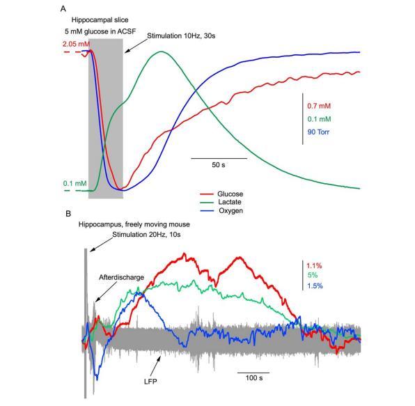 然而,該研究中的所有體外記錄都是在室溫和含有2.5毫摩爾葡萄糖的ACSF中進行的,作者認為這是一個"類似于體內"的濃度。同時,體外切片和體內的葡萄糖消耗量也大不相同。在切片中,由于靜息狀態下的大量消耗,組織內的基礎葡萄糖濃度幾乎是灌流液的一半(見圖4A)。在突觸激活過程中,細胞外葡萄糖和氧氣水平會下降,并在刺激后緩慢恢復。相反,在活體大腦中,網絡激活過程中消耗的葡萄糖和氧氣會迅速從血管中補充回來(見圖4B)。因此,在ACSF中含有2.5毫摩爾葡萄糖的情況下,切片組織中的葡萄糖濃度即使在靜止時也只有約1毫摩爾,這當然是一種缺糖狀態,而在突觸刺激過程中葡萄糖濃度會進一步降低。