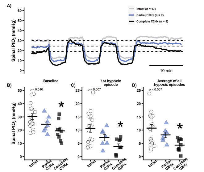 圖2、脊柱C2半切(C2Hx)后兩周,基線和中度急性間歇性缺氧(AIH)發(fā)作期間膈運動核附近的脊髓組織氧壓(PtO)受損。A)mAIH期間所有完整,部分C2Hx和完整C2Hx大鼠的脊髓PtO平均痕跡。B-D)脊柱PtOat基線,分別在第一次缺氧發(fā)作期間和三個缺氧發(fā)作的平均值。單因素方差分析在面板上產生p值。