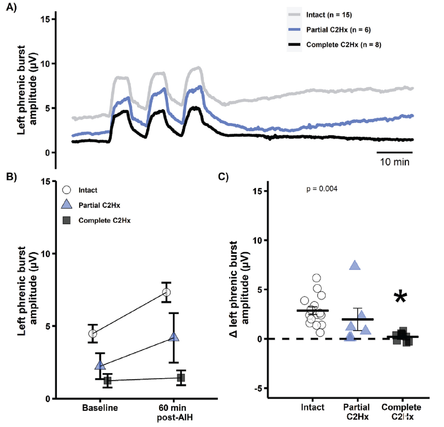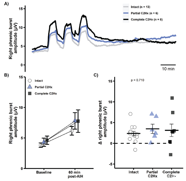 圖5、膈肌長期促進作用(LTF)在脊髓C2半切(部分和完全C2Hx)兩周后損傷側得以保留。A)在完整(灰色線)、部分C2Hx(藍色線)和完全C2Hx大鼠的中度急性間歇性缺氧(AIH)實驗中,平均右側膈肌爆發(fā)峰值振幅曲線。B)實驗組在基線和60分鐘后中度急性間歇性缺氧(mAIH)期間右側膈肌爆發(fā)峰值振幅的平均積分值±平均標準誤差。C)膈肌收縮波的總體變化量從基線到60分鐘的峰值振幅MAIH后。