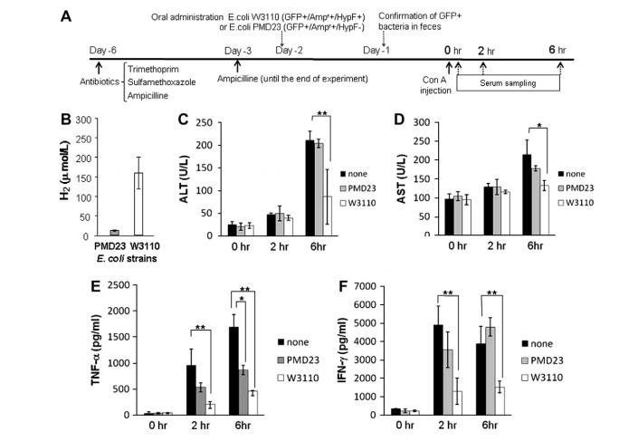 實驗方案C(ExperimentalProtocol-C):(1)小鼠自由飲用與方案B相同的三種抗生素混合物水,持續3天。(2)隨后三天,動物自由飲用含有氨芐青霉素(1mg/ml)的水。(3)向兩組小鼠注射ConA(15mg/kg,生理鹽水溶液):(a)一組用大腸桿菌W3110gfp?重建菌群(n=5/組);(b)另一組用大腸桿菌PMD23gfp?定植(n=5/組)。將在對數生長期中期的兩株大腸桿菌收集起來,在ConA注射前2天,使用Popper灌胃針灌胃給予小鼠(10?細菌/100μl含5%羧甲基纖維素的生理鹽水/只)。ConA注射后,兩組小鼠仍供應含有氨芐青霉素的飲用水。實驗方案C的示意圖見圖3A。