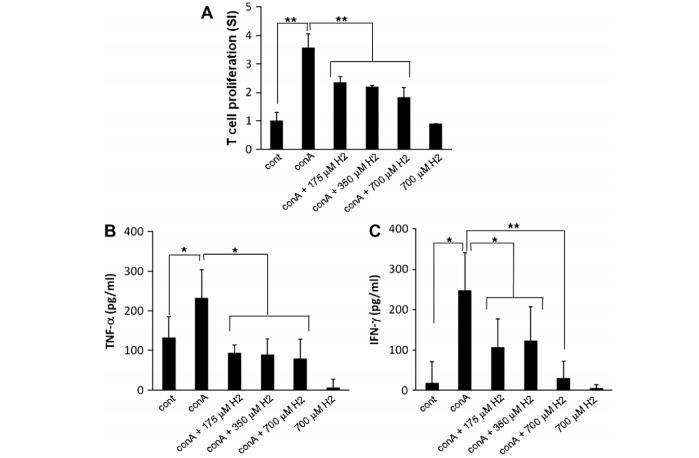 人們認(rèn)為從活化的T細(xì)胞釋放的TNF-α和IFN-γ在ConA誘導(dǎo)的肝炎模型中引起肝組織損傷。因此,為了探討H?是否會影響ConA刺激的T細(xì)胞產(chǎn)生TNF-α和IFN-γ,在體外用ConA刺激脾單核淋巴細(xì)胞(MNL),并在存在或不存在H?的情況下進行。如圖4所示,與在無H?條件下用ConA刺激MNL相比,培養(yǎng)基中存在H?顯著抑制了MNL的增殖(圖4A)以及TNF-α和IFN-γ的產(chǎn)生(圖4B和C)。值得注意的是,H?本身對未刺激MNL的增殖或IFN-γ的產(chǎn)生均無影響。因此,這項體外研究有力地支持了H?可以抑制ConA介導(dǎo)的T細(xì)胞活化的前提,而T細(xì)胞活化會導(dǎo)致組織破壞性的TNF-α和IFN-γ產(chǎn)生。