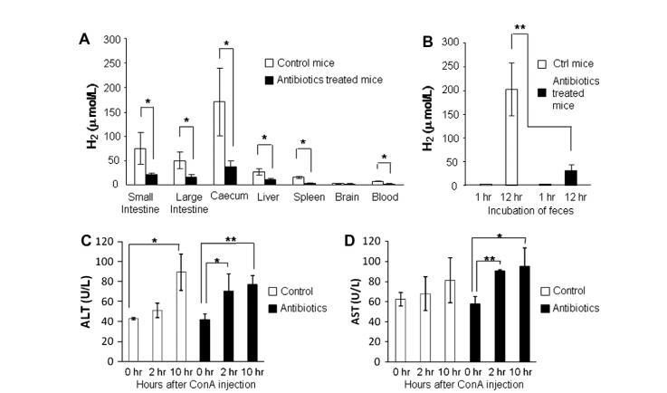 為了探究產(chǎn)生H?的共生菌在腸道中的存在是否會影響小鼠對ConA誘導(dǎo)的肝損傷的易感性,向經(jīng)過或不經(jīng)過抗生素預(yù)處理的小鼠靜脈注射ConA(15mg/kg)(實驗方案A)。基線ALT和AST水平在預(yù)處理組和未處理組小鼠之間沒有差異(圖1C和D),表明抗生素沒有造成肝損傷。注射后2小時測得的血清ALT和AST水平在抗生素處理小鼠中顯著高于未處理小鼠(圖1C和D)。組織學(xué)分析也顯示,與未處理對照小鼠相比,抗生素處理小鼠的肝組織損傷更嚴(yán)重(見補充數(shù)據(jù)1),表明抗生素處理增加了小鼠對ConA誘導(dǎo)肝炎的易感性。換句話說,在沒有抗生素的情況下,腸道細(xì)菌菌群的存在似乎為抵抗ConA誘導(dǎo)肝炎的發(fā)生提供了足夠的保護。