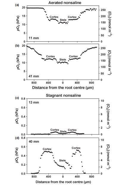 在停滯溶液中的根中,徑向pO?剖面顯示,與通氣處理中的根相比,這些根內的皮層和中柱pO?顯著降低。對于停滯非鹽溶液中的根,在根尖區(qū)域徑向pO?剖面大致平坦,皮層和中柱的pO?分別約為0.07±0.02 kPa和0.02±0.003 kPa(圖3c)。停滯含鹽溶液中根的相應pO?在皮層和中柱均低于檢測限(<0.02 kPa)。當在近根尖區(qū)域測量徑向剖面時,pO?高于根尖附近,并且在根的任意半徑處都更高。停滯處理中根在近根尖區(qū)域的徑向剖面特點是:在停滯非鹽(圖3d)和停滯含鹽處理中,pO?在外層根細胞層(表皮和亞表皮)中從脫氧溶液中的約0 kPa輕微上升到這些根外層組織中的平均0.5和0.4pm 0.2 kPa。pO?在皮層中相當恒定,但在穿過內皮層/周皮層時急劇下降至非常低的壓力,在停滯非鹽(圖3d)和停滯含鹽處理中,根中柱內的壓力分別為0.2和0.045±0.045 kPa。