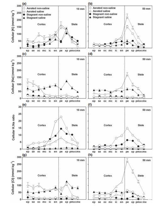 鉀鈉比-距根尖后方10 mm K:Na比率在通氣非鹽根中最高,從表皮的2.2到周細胞的23不等(圖4e)。鹽度和停滯處理都導致K:Na比率降低:在通氣含鹽和停滯非鹽根的細胞中,比率(分別)從亞表皮的0.4和0.7到周細胞的8.2和14.5變化,