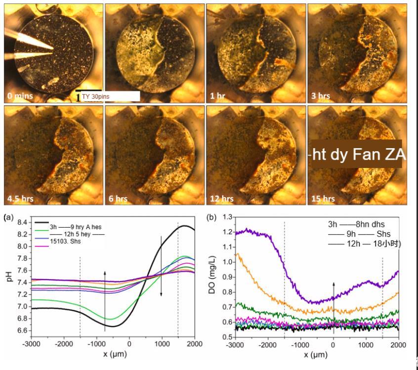微電極陣列技術(shù)常用于測(cè)試金屬與其他有機(jī)或無(wú)機(jī)材料相界面腐蝕電位、電流的二維分布信息,有助于進(jìn)一步研究金屬/溶液、金屬/有機(jī)材料或無(wú)機(jī)材料界面等多相界面的不均勻性、腐蝕產(chǎn)物在多相環(huán)境內(nèi)的傳輸過(guò)程、金屬基材的缺陷分布及與復(fù)合材料界面腐蝕破壞的發(fā)生和發(fā)展過(guò)程,彌補(bǔ)了經(jīng)典電化學(xué)測(cè)試技術(shù)只能測(cè)量界面統(tǒng)計(jì)平均信息的不足。該技術(shù)近年來(lái)已成功應(yīng)用于電偶腐蝕、涂層失效、微生物腐蝕、緩蝕機(jī)理、縫隙腐蝕、鋼筋混凝土腐蝕、特殊海洋環(huán)境下的腐蝕等諸多腐蝕研究領(lǐng)域,并取得了很大的進(jìn)展。
