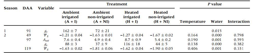 在第二季,中午的莖干水勢(shì)(ψs)反映了對(duì)NI葡萄藤的水分脅迫。升溫葡萄藤?zèng)]有表現(xiàn)出水分脅迫,在氣體交換性狀或ψs方面與灌溉沒有相互作用(表1)。在第二季中,有兩次觀察到NI藤蔓的gs受到類似的抑制,與A+I藤蔓相比,光飽和時(shí)的二氧化碳凈同化(Asat)顯著降低(表1)。