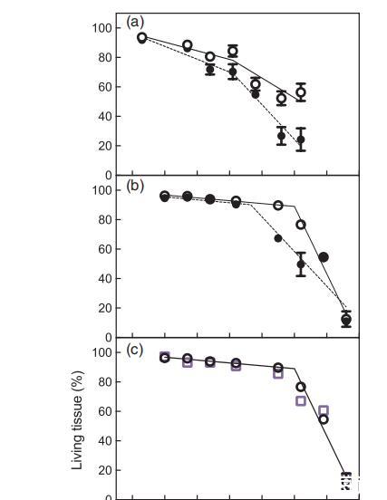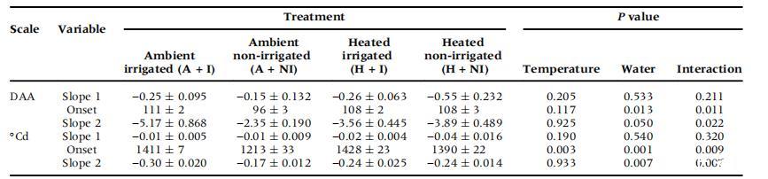 將第2季的CD與花期開始的熱時(shí)間作圖(圖3e),結(jié)果表明,與A+I葡萄藤相比,A+NI葡萄藤的活體組織開始快速衰退的時(shí)間更早,快速階段(斜率2)也更小(表2)。升溫增加了CD快速階段開始的熱時(shí)間,并且與灌溉有顯著的交互作用(表2)。缺水減緩了未升溫葡萄植株活體組織的快速衰退(斜率2),且與溫度有顯著的交互作用(表2)。在快速階段開始之前,處理或交互作用對(duì)CD緩慢階段的斜率沒有影響(表2)。