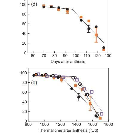 圖3、第1季(a)和第2季(b-d)從花期開始的一段時(shí)間內(nèi)漿果活體組織的比例,以及從花期開始的熱量時(shí)間內(nèi)(e)比較以下處理:常溫灌溉(A+I)(白圈)、常溫非灌溉(A+NI)(黑圈)、升溫灌溉(H+I)(白方塊)、升溫非灌溉(H+NI)(橙方塊)。為清楚起見,(c)中重復(fù)了A+I,以便與H+I進(jìn)行比較;(d)中重復(fù)了A+NI,以便與H+NI進(jìn)行比較。