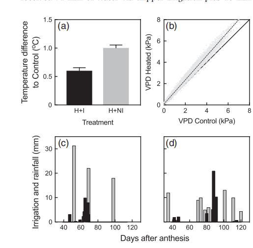 在第2季的40至125 DAA期間,常溫灌溉處理的日最高環(huán)境溫度為21.2至44.5攝氏度,而日最低溫度為6.3至22.8攝氏度。同期,升溫灌溉的日最高氣溫平均升高0.6攝氏度,升溫非灌溉的日最高氣溫平均升高1.0攝氏度(圖1a),但對(duì)最低氣溫沒有影響。灌溉型葡萄樹較大的樹冠削弱了被動(dòng)升溫的效果。VPD的升高與最高溫度的升高成正比(圖1b)。