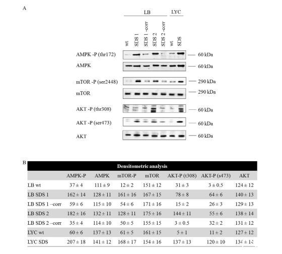 如預(yù)期的那樣,在SDS細(xì)胞中,AMPK比對(duì)照組更活躍,如蛋白磷酸化形式的Western印跡分析所示(圖3)。令人驚訝的是,我們發(fā)現(xiàn)與正常對(duì)照組和校正對(duì)照組相比,mTOR并未受到抑制,反而高度磷酸化。