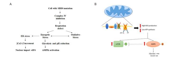 能量應(yīng)激會(huì)誘導(dǎo)細(xì)胞新陳代謝發(fā)生變化,從而刺激或抑制參與能量平衡調(diào)節(jié)的分子網(wǎng)絡(luò),如AMPK和mTOR。在觀察到的SDS細(xì)胞中,由于能量應(yīng)激,AMPK被過(guò)度激活,糖酵解途徑受到刺激。令人驚訝的是,我們還發(fā)現(xiàn)AKT/mTOR通路被異常地過(guò)度激活,因?yàn)檫@兩種蛋白都被過(guò)度磷酸化。我們推測(cè),mTOR過(guò)度激活是SDS細(xì)胞支持能量缺陷和蛋白質(zhì)合成的一種方式,目的是改善OXPHOS活性。然而,用mTOR拮抗劑雷帕霉素處理SDS細(xì)胞可完全抑制殘余的OXPHOS活性,從而減少ROS的產(chǎn)生,進(jìn)而通過(guò)糖酵解恢復(fù)能量。這表明,在SDS細(xì)胞生化改變的過(guò)程中,OXPHOS活性的增加在保證ATP產(chǎn)量增加的同時(shí),也可能導(dǎo)致氧化應(yīng)激的增強(qiáng)和細(xì)胞損傷的潛在增加(圖6)。在AMPK激活的情況下,mTOR激活的另一個(gè)潛在機(jī)制可能與自噬激活有關(guān)。在核糖體病中,氧化應(yīng)激的增加會(huì)通過(guò)mTOR-S6激酶途徑誘導(dǎo)自噬。考慮到本手稿中報(bào)告的數(shù)據(jù),我們可以假設(shè)AMPK活性增強(qiáng)可能與細(xì)胞能量狀態(tài)受損有關(guān),而mTOR通路激活可能與氧化應(yīng)激產(chǎn)生水平較高有關(guān)。