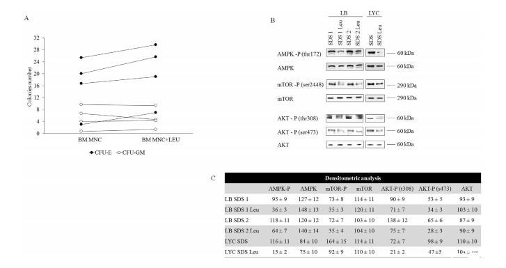 然后,我們測(cè)試了Leu對(duì)SDS患者骨髓造血干細(xì)胞生長(zhǎng)的影響,觀察到紅細(xì)胞集落生長(zhǎng)適度增加,但髓系細(xì)胞集落生長(zhǎng)沒(méi)有增加(圖5A)。由于Leu是mTOR激活的調(diào)節(jié)劑,我們研究了它在慢性SDS細(xì)胞處理后對(duì)能量應(yīng)激途徑的影響。不出所料,AMPK磷酸化的減少是正常OXPHOS恢復(fù)的結(jié)果。有趣的是,Leu處理后AKT和mTOR磷酸化水平也降低了(圖5B)。可以推測(cè)這些影響是由于依賴于營(yíng)養(yǎng)過(guò)剩的AKT/mTOR通路的反饋調(diào)節(jié)所致。說(shuō)明Leu恢復(fù)了SDS細(xì)胞的生化表型,該分子可被視為恢復(fù)SDS細(xì)胞能量代謝的潛在工具。
