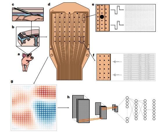 圖1:展示了微創薄片神經接口系統的整體示意圖,包括從大腦皮層獲取神經活動和進行刺激的過程,以及系統在麻醉狀態下用于記錄和刺激的模塊化薄片微電極陣列的植入過程。
