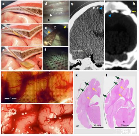 圖2:闡述了神經接口植入在動物模型中的安全性和可逆性,通過“顱骨微切口”技術進行植入,并展示了植入后的效果和組織反應。