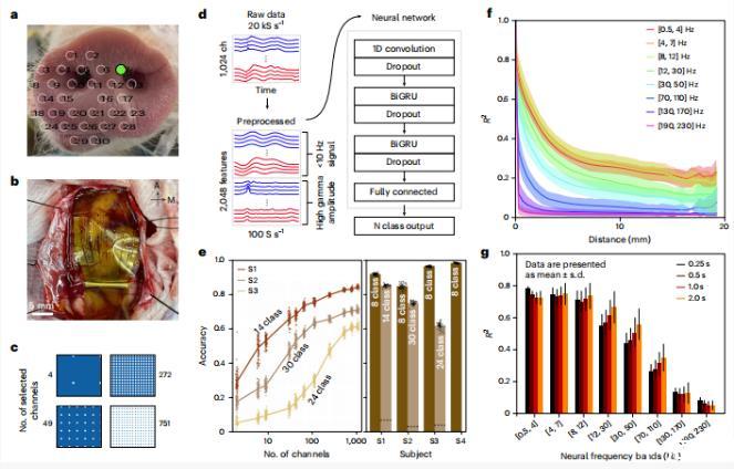 圖4:描述了基于深度學習的神經解碼方法,展示了系統在解碼體感、視覺和運動活動方面的性能,以及不同電極密度對解碼精度的影響。