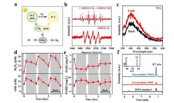 圖4、PCC6803-M.b-Fe-EDTA的非生物甲烷生成。a)使用PCC6803-M.b-Fe-EDTA的非生物甲烷生成示意圖。b)?CH3、?OH和?O2-的EPR譜圖。c)使用o-tolidine作為過氧化物指示劑的H2O2的UV/Vis吸收譜圖。d-e)H2O2和?OH(d),以及Fe(II)和Fe(III)(e)濃度的典型時間變化?;疑珔^域表示黑暗期。f)表征DMS和DMSP作為甲基供體(插圖顯示了DMS的質譜圖)。