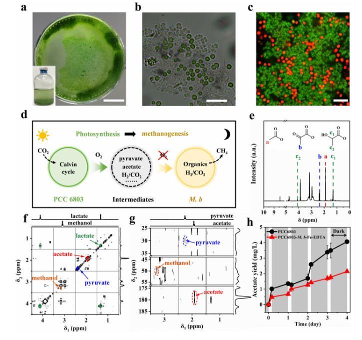 圖3、共培養生物膜和產生的有機物質的特征化。a培養瓶中的密集生物膜(插圖顯示了培養瓶的圖片)。b光學顯微鏡圖像和c FISH圖像,使用M.b(綠色熒光探針)和PCC6803(紅色,自體熒光);代表10幅圖像。d生物甲烷生成的示意圖,通過PCC6803-M.b-Fe-EDTA驅動的中間產物。e通過ROS氧化生成的可能有機物質。f gCOSY(f)和gHMBC(g)重疊的水溶液600-MHz NMR光譜,分別為共培養6天后的上清液(黑色),0.1 M乳酸(綠色),0.1 M醋酸(紅色),0.1 M丙酮酸(藍色),和0.1 M甲醇(橙黃色)。在(g)中的紅色圓圈峰歸屬于醋酸,藍色圓圈峰歸屬于丙酮酸,橙黃色圓圈峰歸屬于甲醇。h在4小時-20小時的光-暗周期下醋酸濃度的變化?;疑珔^域表示黑暗期。數據以平均值±標準差表示,來自n=3次獨立實驗。比例尺:a為1μm,b為10μm,c為10μm。
