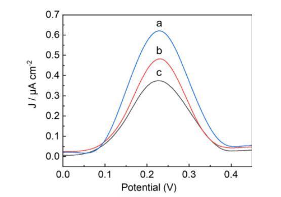 接下來,采用高靈敏度的差分脈沖伏安法(DPV)追蹤修飾過程。如圖4所示,在aCSF溶液(pH 7.4)中,SAC修飾的AuS/CFME在0.22 V(vs.Ag/AgCl)處出現陽極峰,歸因于Fc氧化為Fc?。Fc/Fc?的陽極電流信號強烈依賴于鏈長,SAC電極電流響應最大(曲線a),但隨著適配體鏈長的增加,電流響應逐漸減?。ㄇ€b和c)。這些結果表明,較長的適配體修飾鏈導致Fc/Fc?與電極表面距離增加,從而減弱電流響應。
