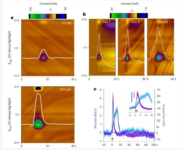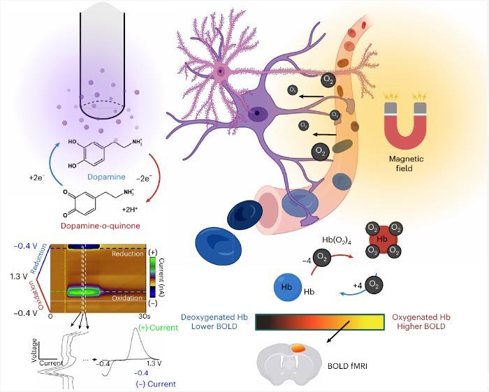 圖3:利用FSCV–fMRI檢測多巴胺和BOLD信號的原理。
