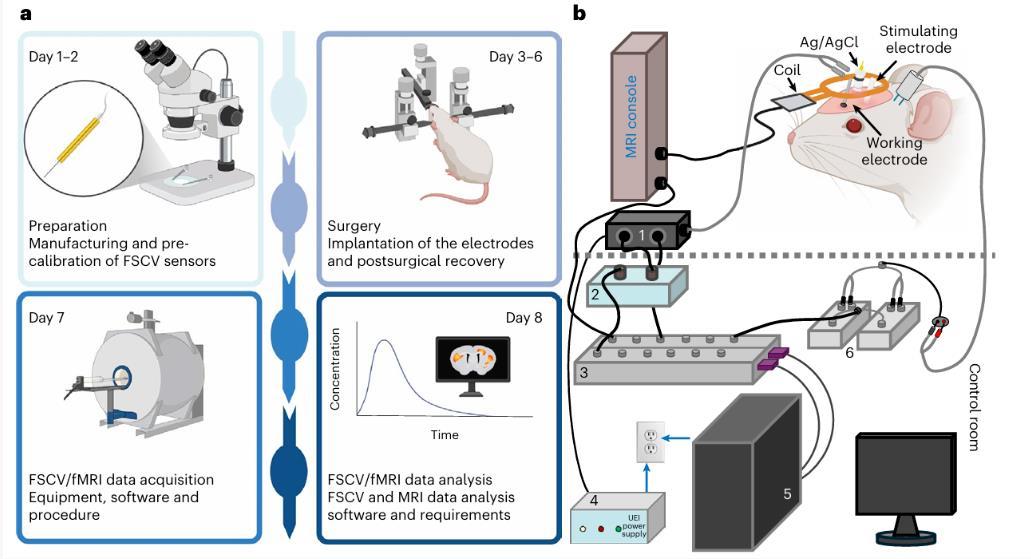 北卡羅來納大學(xué)教堂山分校的Tatiana A.Shnitko、Yen-Yu Ian Shih團(tuán)隊(duì)在《Nature Protocols》發(fā)表的創(chuàng)新性研究,提出了一套將快速掃描循環(huán)伏安法(FSCV)與fMRI深度融合的實(shí)驗(yàn)協(xié)議,首次實(shí)現(xiàn)了活體動(dòng)物腦內(nèi)神經(jīng)化學(xué)動(dòng)力學(xué)與全腦血氧水平依賴(BOLD)信號的同步采集,為破解多模態(tài)整合難題提供了革命性解決方案。該方案通過磁共振兼容硬件設(shè)計(jì)、精準(zhǔn)時(shí)序控制與多階段驗(yàn)證體系,有效克服了偽影干擾、硬件沖突等技術(shù)瓶頸,為探索神經(jīng)血管耦合機(jī)制及相關(guān)疾病病理生理過程開辟了新路徑。