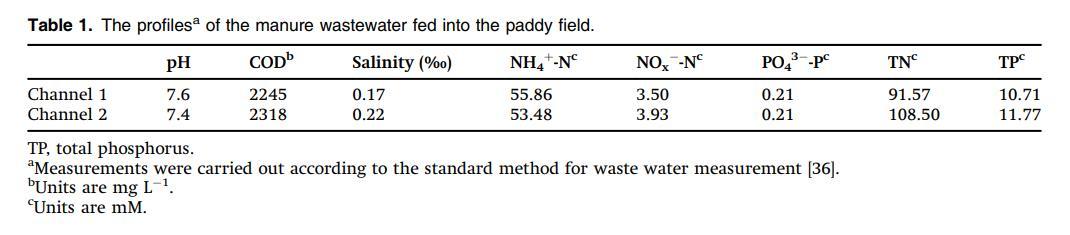 樣本取自中國南方浙江省嘉興市一個典型水稻種植區的稻田。在一個水稻-小麥輪作系統中,糞肥施用(生長季節的4月至每月兩次)已持續20多年。糞肥主要由牲畜廢物(包括尿液、糞便和沖洗水)構成,這些廢物主要在鄰近農場發酵,并通過兩個渠道輸入稻田。糞肥含有高銨態氮(NH4+-N)和化學需氧量(COD;表1)。其中,銨占全氮(TN)含量的49-60%。選擇一個相鄰未受糞肥影響且未種植水稻的地塊作為對照。土壤樣本于2009年11月收獲后(無水淹條件下)從0-100厘米深度采集。從每個地塊取三個土壤巖心(直徑約5厘米),將同一深度(每10厘米間隔)的樣本混合形成一個復合樣本。樣本在運輸到實驗室時密封在無菌塑料袋中并置于冰上。一部分在4°C儲存用于培養實驗,另一部分通過2.0毫米篩用于土壤特性分析。其余部分在-80°C儲存用于DNA提取和下游分析。
