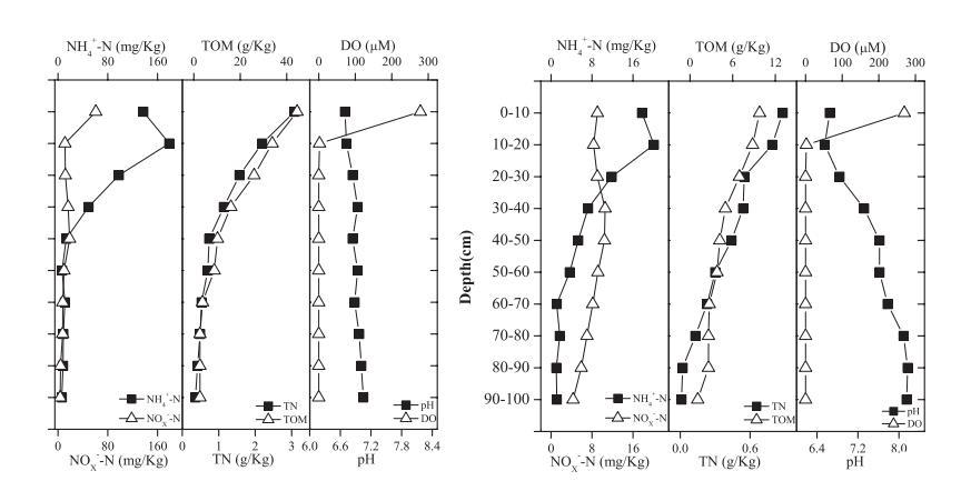 測量了每10厘米深度處銨態氮(NH4+-N)、亞硝酸鹽加硝酸鹽氮(NOx--N)、TN、總有機質(TOM)、pH和氧氣(DO)的垂直剖面(圖1)。