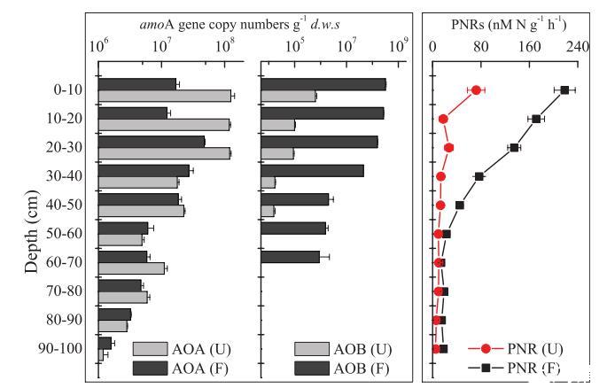糞肥施用對土壤硝化的影響也通過PNRs的變化反映出來。在施用糞肥土壤中檢測到的PNRs(14-218 nmol L-1 N g-1 h-1)顯著高于(p<0.05)未施用土壤的PNRs(5-72 nmol L-1 N g-1 h-1),最高值出現在表層(0-10厘米)。PNRs迅速下降直到犁底層(20-30厘米),并在施用糞肥和未施用土壤巖心的深層(60-100厘米)分別維持在14-23和5-14 nmol L-1 N g-1 h-1之間,變化較小。此外,注意到PNRs的變化與細菌amoA基因拷貝數的變化一致。