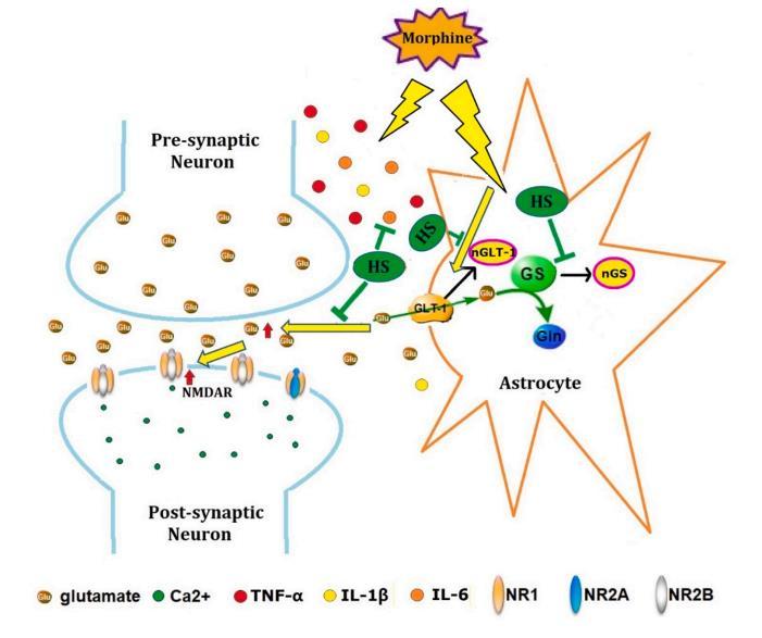 嗎啡的反復(fù)鞘內(nèi)給藥一方面增加了TNF-α和IL-1β等炎癥因子的水平和IL-6的釋放,激活了脊髓背角的星形膠質(zhì)細胞,另一方面導(dǎo)致了GLT-1和GS的硝酸化表達,增加了突觸間隙中谷氨酸的濃度,促進了含有NR2B亞基的NMDA受體的膜販運,導(dǎo)致了中樞敏化和嗎啡耐受。HS預(yù)處理可減少炎癥細胞因子的增加,抑制GLT-1和GS的硝化表達,減少NMDA受體的膜販運。因此,HS可能為預(yù)防嗎啡耐受提供了可能。