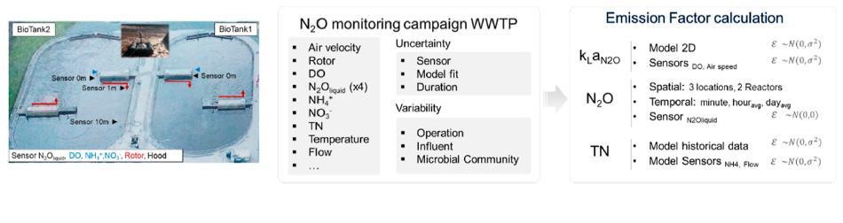 圖1、左:BioTanks和unisense N2O原位監(jiān)測設(shè)備。右圖:N2O監(jiān)測程序以及排放系數(shù)(EF)計算過程中變異性和不確定性的影響因素。
