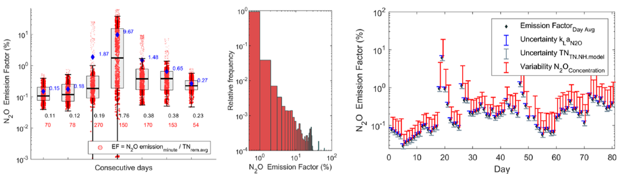圖4、左:N2O發(fā)射系數(shù)7天(僅通氣期的箱線圖,右圖中的第16至22天)。N2O排放的單個值(紅色標記、箱線圖)和平均值(藍色標記、藍色文本)用于恒定的平均TN去除。中位數(shù)(黑色文本)和變異系數(shù)(紅色文本,%)。中心:根據(jù)數(shù)據(jù)頻率1/min計算的發(fā)射系數(shù)的直方圖。右:平均排放系數(shù)(黑色標記)、液體測量的相應(yīng)每日N 2O變異性(紅色條)以及與剝離項。(藍色條,情況c)和TN(灰色條,情況d)]相關(guān)的不確定性。