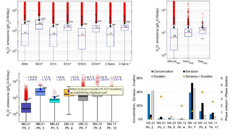 圖3、左圖:BioTank2中沿水流的三個傳感器的N2O發(fā)射:S0m、S1m、S10m以及三個傳感器的組合。總排放量和僅曝氣期排放量的箱線圖。箱線圖內(nèi)帶有凹口的中值表示中位數(shù)的95%置信區(qū)間。黑菱形表示平均值和正標準差。右圖:分鐘、平均小時和平均每日值的N2O排放量(n=117602、1960和80)。底。左圖:基于S1m的BioTank2的N2O排放量(gN/天),按統(tǒng)治相(Ph)、箱線圖和均值(藍色菱形)分組。N和D對應(yīng)硝化和反硝化,數(shù)字表示BioTank正在進料和排出。第一個和第二個字母/數(shù)字分別指BioTank1和2。總持續(xù)時間的黑色(%)和藍色(%)占總排放負荷的分數(shù)。右圖:N2O的平均液體濃度(每相平均濃度值占所有相平均濃度值之和的百分比,藍色條)、N2O排放量(每相排放量占總排放量的百分比,黑色條)、時間(占總排放量的百分比,灰色條)和相相持續(xù)時間的相排放分數(shù)(黃色菱形)。
