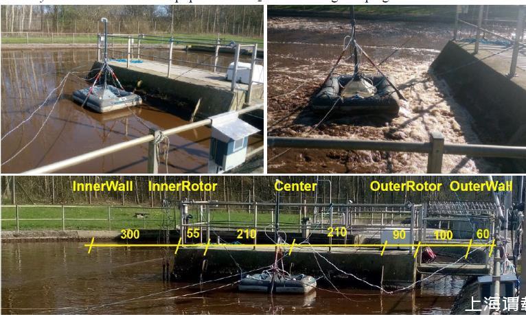 圖2、四個液體傳感器(Unisense Environment A/S,丹麥)監(jiān)測N2O濃度。一個傳感器平行于轉(zhuǎn)子,在BioTank2(S0m)和BioTank1(S0m*)中最低湍流。在BioTank2中,也處于最高湍流。以及氣泡傳輸結(jié)束的下游(S10m)。一個浮動室(0.95 m2)記錄了平行和垂直于水流的不同距離處的氣體流量和溶解氧濃度。假設(shè)所有轉(zhuǎn)子的剝離結(jié)果相同。