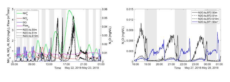 研究簡介:氧化亞氮(N?O)是一種強效溫室氣體,其在污水處理過程中的排放對污水處理廠的碳足跡影響顯著。N2O的產(chǎn)生與污水處理中的氮轉(zhuǎn)化過程密切相關(guān),包括氨氧化細菌(AOB)和異養(yǎng)反硝化細菌的作用。N?O的排放受到多種因素的影響,包括操作條件、微生物群落結(jié)構(gòu)、進水水質(zhì)等。然而以往的研究往往忽視了數(shù)據(jù)的變異性,僅使用平均排放因子來估算N2O排放,這可能導致估算結(jié)果的不準確。研究人員在BioTank1和BioTank2中安裝了多個N2O液相傳感器,分別位于不同的位置,以捕捉N2O排放的時空變異性。通過氣體剝離模型(kLaN?O)計算N?O的排放量,并結(jié)合液相N?O濃度數(shù)據(jù),量化了N2O排放的時空變異性。研究還分析了不同監(jiān)測策略對N?O排放估算的影響,包括監(jiān)測頻率和監(jiān)測位置的數(shù)量。