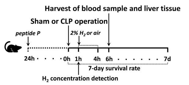 圖1:實(shí)驗(yàn)設(shè)計(jì)。雄性C57BL/6J小鼠(6-8周大,體重20-25g)接受假手術(shù)或CLP手術(shù)。我們使用2%的氫氣(H2)或新鮮空氣處理小鼠,從假性或CLP手術(shù)后1小時開始,持續(xù)3小時。為了驗(yàn)證FUNDC1的關(guān)鍵作用,我們在CLP或假手術(shù)前24小時給小鼠腹腔注射細(xì)胞穿透肽P(一種FUNDC1抑制劑);其他組則注射相同體積的生理鹽水。在假手術(shù)或CLP手術(shù)后6小時收集各組小鼠的血清樣本和肝組織。