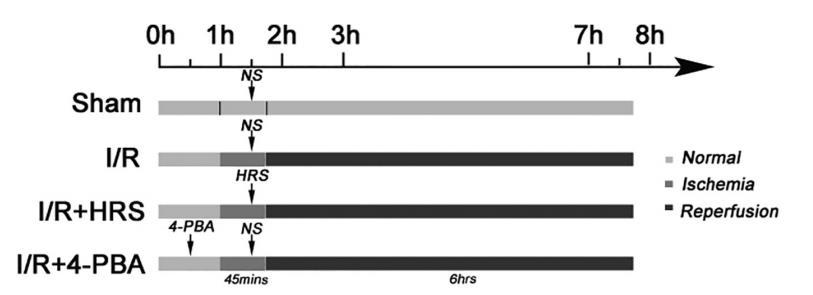 32只大鼠被隨機分為四組(每組n=8),如圖1所示:Sham組、I/R組、HRS組和4-PBA組。IIRI大鼠參照Megison描述的方法建立。用無創動脈夾夾住SMA,誘導缺血45分鐘,然后再灌注6小時。每只大鼠腹腔注射3ml/kg10%水合氯醛進行麻醉。操作過程中應注意無菌操作。
