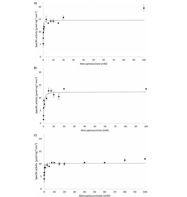當將His93、His95和His163替換為亮氨酸時,對蛋白質三級結構的影響應盡可能小,觀察到的酶動力學數據變化應歸因于側鏈功能基團的丟失而非蛋白質結構的丟失。出于相同原因,C100被絲氨酸取代,從而將半胱氨酸的巰基變為羥基。使用Ellman試劑的定性酶測定顯示MsdoH93L、MsdoH95L、MsdoH163L和MsdoC100S無活性。此外,這些變體與亞鐵離子預孵育未產生任何積極效果(數據未顯示)。此外,當用氧電極測量活性時,無法確定這些變體的動力學數據。因此,未進行進一步表征。