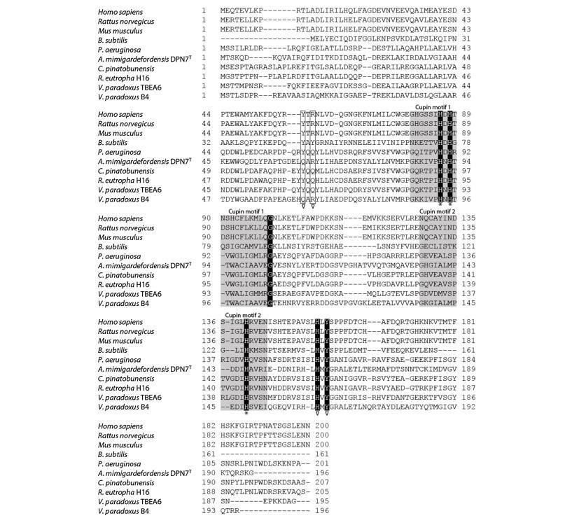 Cdo及其同源物氨基酸序列中存在三個高度保守的組氨酸殘基(圖1),這些殘基對輔因子配位和底物定位重要。Msdo中位置93、95和163的三個組氨酸殘基各被亮氨酸殘基替換。由于對應H93和H95的兩個組氨酸殘基被認為對半胱氨酸雙加氧酶及其同源酶中的輔因子配位至關重要,生成的變體觀察到的酶活性完全喪失證實了這些氨基酸在MsdoB4中的預期重要性。鐵輔因子的重要性先前已詳細研究。其中描述Msdo在沒有Fe(II)作為輔因子時未顯示任何活性,且其他金屬離子(例如銅)無法恢復酶活性。此外,H163顯然也對酶活性至關重要,thus表明其在底物在Msdo活性位點中定位的重要作用,如同人類Cdo活性位點中的H155。