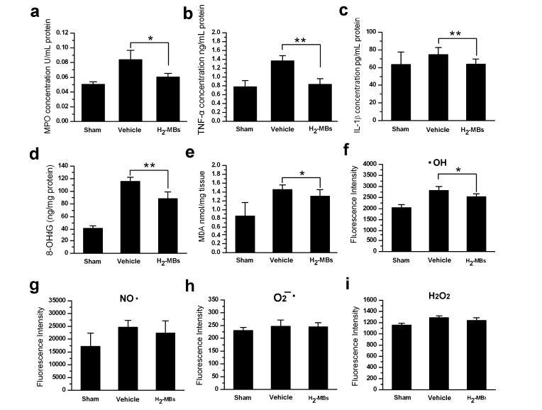 圖6.心肌促炎和促氧化細胞因子以及ROS的ELISA分析。從接受假手術(shù)處理、車輛處理或H2-MB處理的大鼠獲得心臟組織勻漿,這些大鼠經(jīng)歷了30分鐘的缺血和24小時的再灌注,以分析產(chǎn)生的心肌促炎和促氧化細胞因子。為了檢測ROS,在經(jīng)歷30分鐘缺血后,大鼠在再灌注40分鐘前靜脈注射了載體或H2-MBs。所有檢測的心肌促炎和促氧化細胞因子的水平在心肌缺血再灌注后均增加,但在大鼠接受H2-MBs后,這些水平以不同程度降低。(a?c)然后檢測了包括MPO、TNF-α和IL-1β在內(nèi)的促炎細胞因子水平(n=6)。*P<0.05,**P<0.01。數(shù)據(jù)表示平均值±s.d。(d,e)檢測了促氧化劑8-OHdG和MDA細胞因子的水平(n=6)。*P<0.05,**P<0.01。數(shù)據(jù)表示平均值±s.d。(f?i)通過測量它們與HPF、DAF-2、NBT或CM-H2DCFDA的反應性來檢測勻漿中自由基(?OH、NO?、O2??)和H2O2的水平。使用自動微板讀數(shù)器測定熒光強度,具體描述見方法部分(n=3)。*P<0.05,**P<0.01。數(shù)據(jù)表示平均值±s.d.