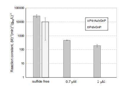 Pd/xGnP催化劑在硫化物存在下完全失活,而Pd-Au/xGnP催化劑顯著失活,但未完全失活(圖10)。在無硫化物、0.7μM硫化物和2μM硫化物存在下,Pd-Au/xGnP催化劑觀察到的二級反應速率常數分別為469±35和192±38(MH2·s)-1(gPd/L)-1。與無硫化物脫氯實驗中Pd/xGnP和Pd-Au/xGnP的反應性相比,Pd-Au/xGnP催化劑的反應速率常數分別降低了56倍和137倍。盡管在硫化物存在下降低了兩個數量級以上,但觀察到的反應速率常數與在相同實驗系統中使用商業Pd/Al2O3催化劑在無毒物條件下獲得的值(321±77(MH2·s)-1(gPd/L)-1)相當。
