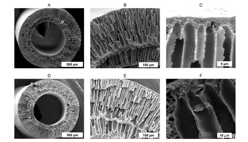 所有中空纖維膜的橫截面形態相似,特征為支撐層上的薄“致密層”,支撐層包括大宏孔(圖3)。無xGnP(圖3A-C)和填充xGnP(圖3D-F)膜的橫截面形態未見明顯差異。對于所有納米復合和純PSf膜,以0 cm間隙寬度和2.5 cm間隙寬度制備的膜滲透性存在顯著(α=0.1)差異。