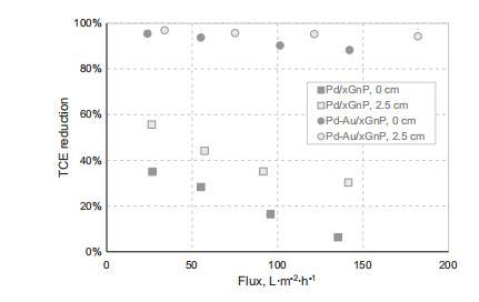 當滲透通量高時,污染物的停留時間短,限制了其在膜反應器內的去除量。然而,Pd-Au/xGnP催化劑更高的反應性使得即使在通量>180 L.m-2.h-1時也能實現>94%的TCE還原(圖9),這為高通量處理TCE污染水提供了可能性。