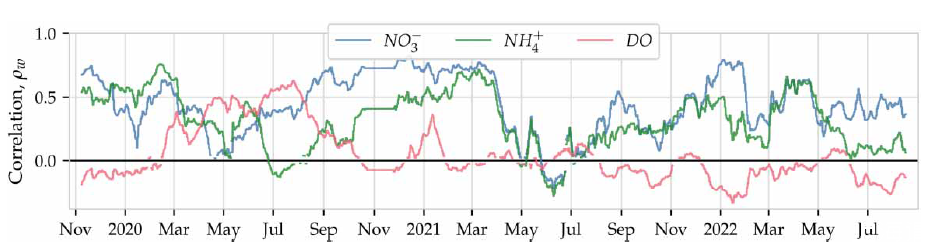 圖5、Fredericia滑動窗口秩相關(guān)性。來自Fredericia的數(shù)據(jù)表明,N2O、NH4和DO之間的相似性在整個(gè)數(shù)據(jù)集中各不相同。N2O和NO3之間的相似性顯示出與N2O和NH4的相似行為。